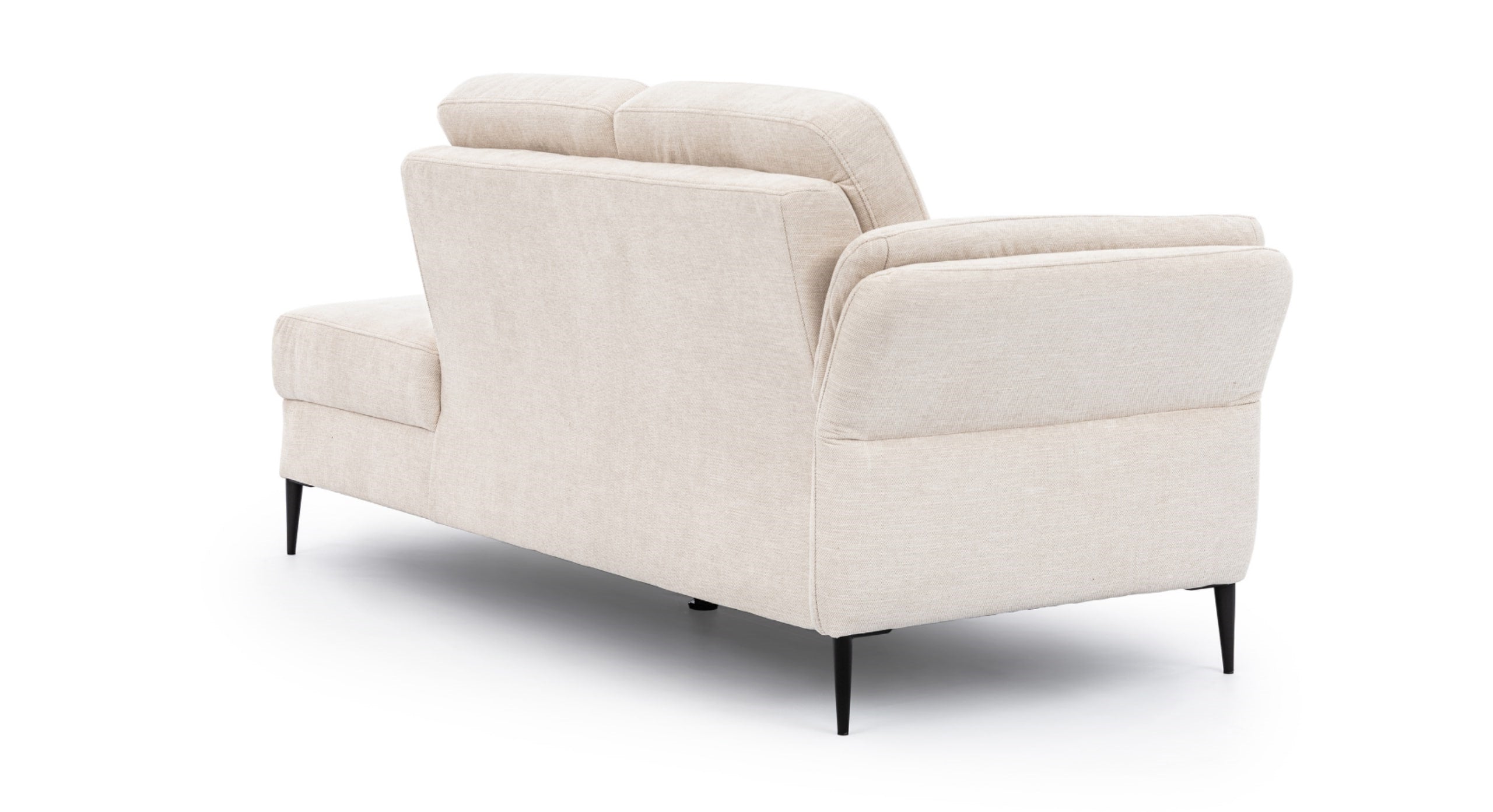De 2-zitsbank / chaise longue Peace combineert comfort en elegantie in een uniek design. De bank bestaat uit een royale 2-zits en een compact eilandje, waardoor het geheel doet denken aan een losstaande chaise longue. Met zijn zachte bekleding straalt de Peace warmte en verfijning uit, terwijl de zwarte metalen spitse poten een modern en strak accent toevoegen. De wijd uitlopende verstelbare armleuningen en de subtiele naad in het midden van de rugleuning geven deze bank een stijlvol en onderscheidend karakter. Verkrijgbaar in diverse stoffen en kleuren, is de Peace een eigentijdse en comfortabele toevoeging aan elke woonkamer.
