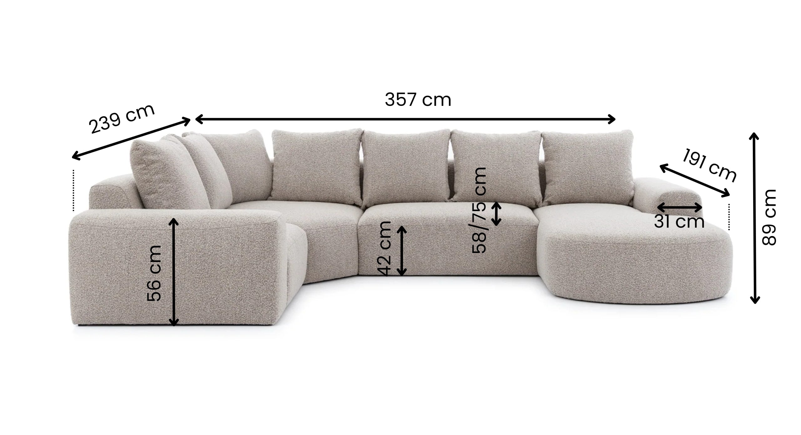 Ontdek de ultieme combinatie van stijl en comfort met onze betaalbare u-bank Comfy met chaise longue voorstaand rechts. Deze trendy u-bank, compleet met losse rugkussens en zonder poten voor een zwevend effect, biedt de perfecte plek om te ontspannen na een lange dag. De u-bank is voorzien van een mooie bouclé stof. Of je nu gasten ontvangt of gewoon wilt relaxen, deze u-bank past zich moeiteloos aan jouw behoeften aan, en dat alles voor een betaalbare prijs.